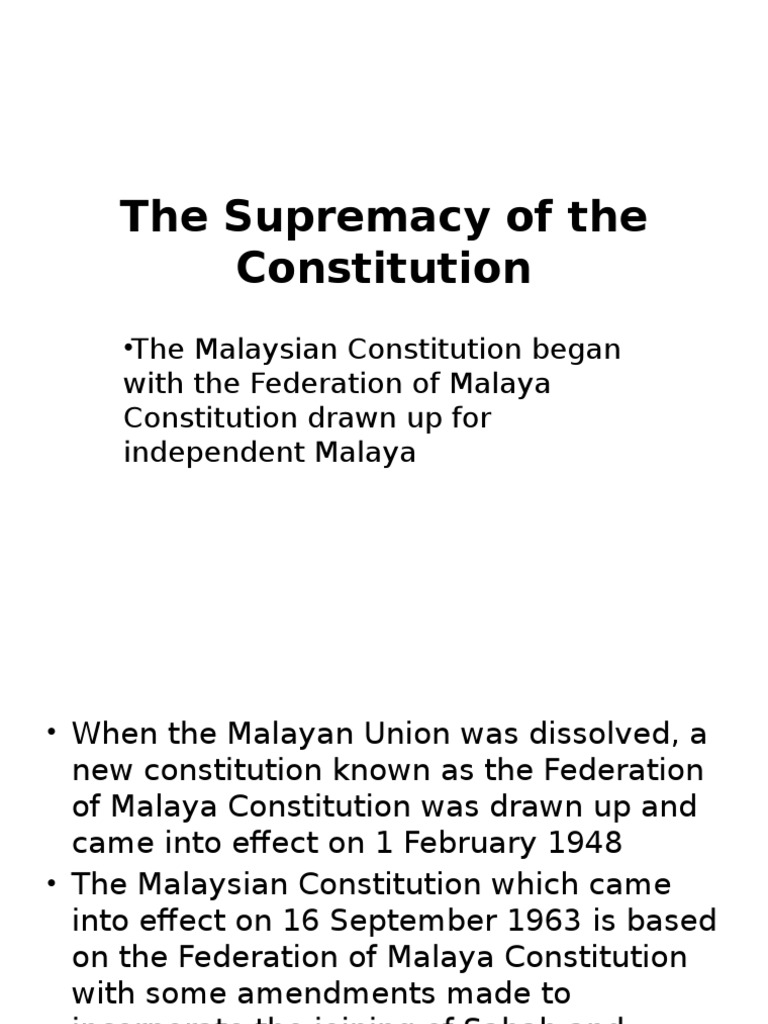 And after merdeka day necessary modification is to be made. In practice governments may ignore aspects of their nation s constitution or interpret them in different ways. The word constitution refers to a codified and uncodified body of rules governing the people as well as the government. Constitutional supremacy is viewed as a check on governmental power.
