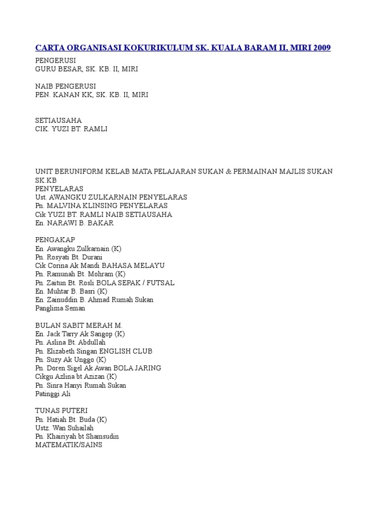 Carta Organisasi Kokurikulum Sk Kuala Baram Ii Miri 2009